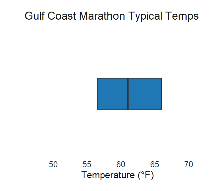 Across all Gulf Coast Marathon races in our dataset, temperature observations averaged 60.4°F with a median of 61°F. Conditions ranged from a low of 47°F to a high of 72°F, showing the significant variability runners face—a 25-degree spread. The standard deviation of 7.2°F indicates most temperatures clustered between 53°F and 67°F (one standard deviation from the mean). Half of all observations fell between 56.5°F and 66°F, representing the typical race-day window runners should prepare for.
