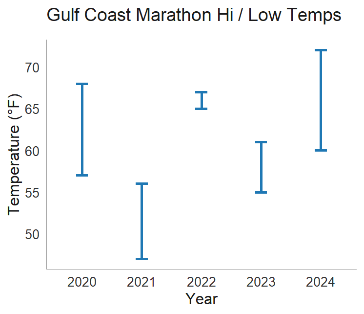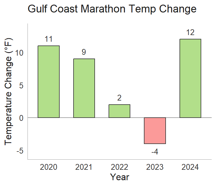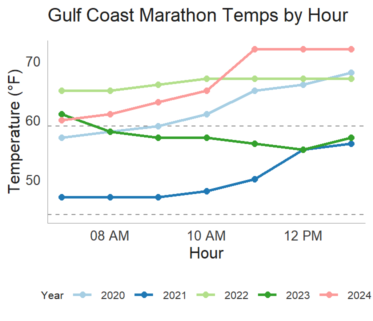 Most running research suggests the ideal marathon temperature falls between 44°F and 59°F—cool enough to manage heat but warm enough to avoid excessive cold stress. Gulf Coast’s average of 60.4°F runs just above this optimal window, pushing the race into the heat-management zone for most runners. While some years dip into the ideal range with lows around 47°F, most race conditions trend warmer, with temperatures frequently climbing into the 65–72°F range where performance penalties accelerate. This consistent drift above the ideal threshold is precisely why Gulf Coast demands a weather-focused pacing strategy. As seen below, only two years saw race temps within the ideal range.
