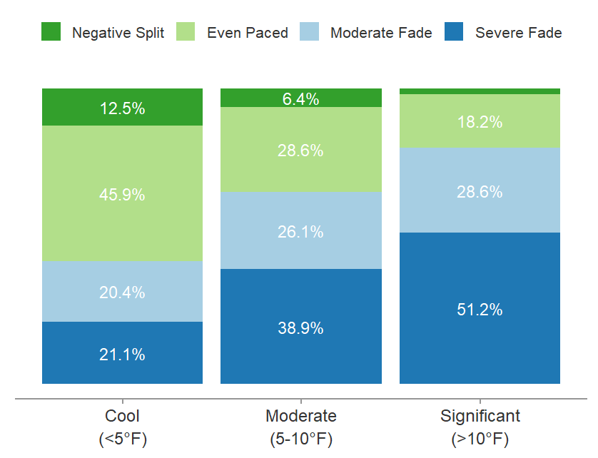 On days with significant warming (>10°F), 51.2% of runners experienced severe fading versus 21.1% on cooler days. The combination of going out too fast PLUS rising temperatures was particularly brutal.