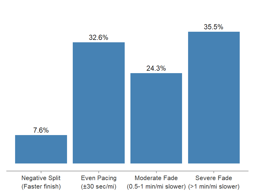 Only 39.6% of runners managed to stay within 30 seconds per mile of even pacing. But those who did likely finished closer to their potential.