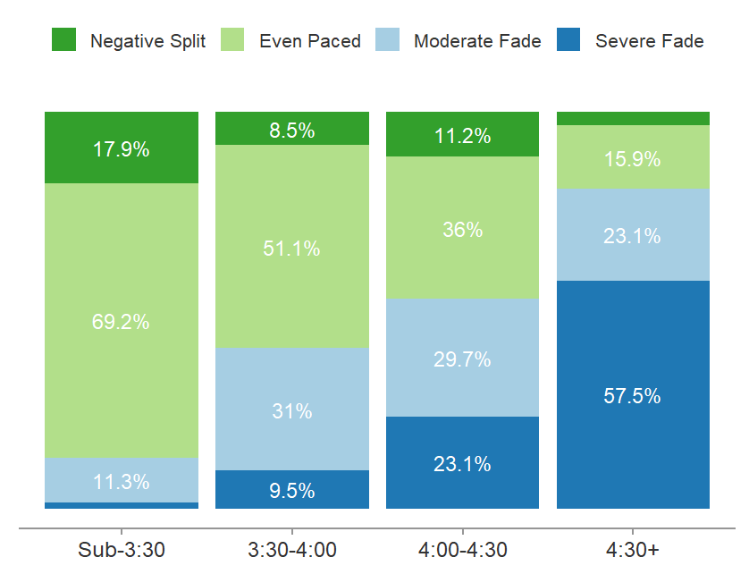 Slower runners struggled more with pacing discipline. Among 4:30+ marathoners, 57% faded by more than a minute per mile, compared to 1.6% of sub-3:30 runners.